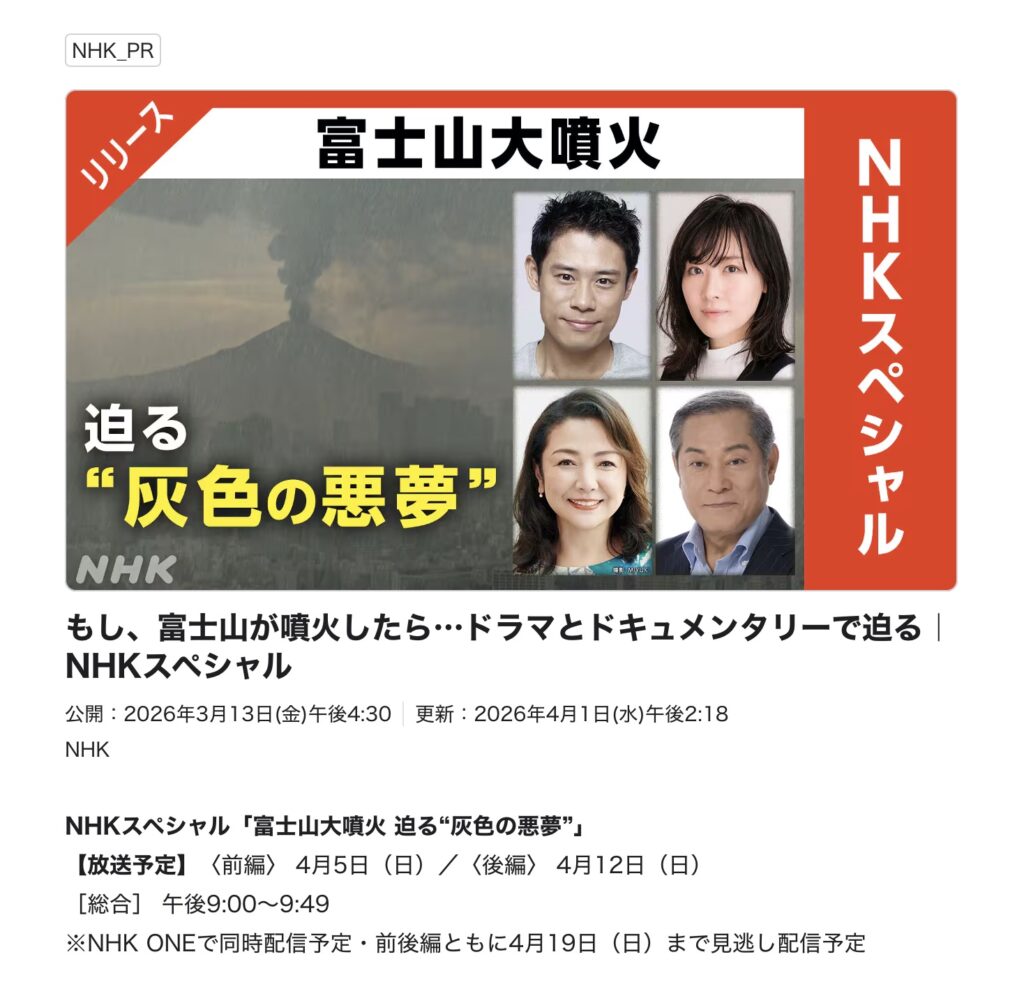 内閣府の広報に続き、今度の日曜日のNスペは富士山噴火。