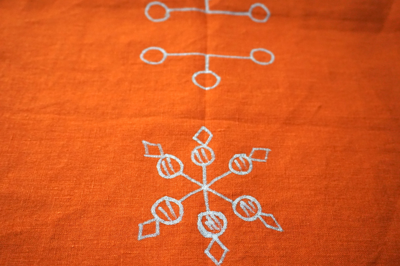 およそ1.4メートル。カラフルな麻布に、シンボルを大きく配置したものです。シンボルはゴールドのアクリルマーカーで描いてあります。それを糸でなぞってみてください。(マーカーは何度か洗濯するうちに消えます)